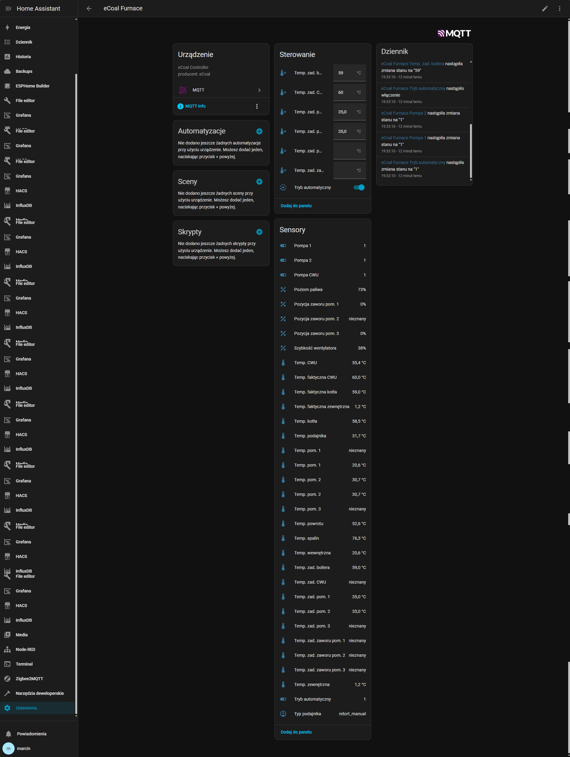 Dziękuję – robota pierwsza klasa! Do pełni szczęścia brakuje mi tylko kilku smaczków, bez których nie mogę spać spokojnie :temperatury z głowicy: value_template: {{ value_json["cmd"]["device"]["reg"][11]["@v"] }} czujnika radiowego: value_template: {{ value_json["cmd"]["device"]["reg"][10]["@v"] }} statusu pompy CWU (ON/OFF) statusu kotła (ręczny / automatyczny) typu podajnika (ręczny / grupowy / eCoal) Chyba że to wszystko już jest, tylko ja jak zwykle coś popsułem. ![]() |