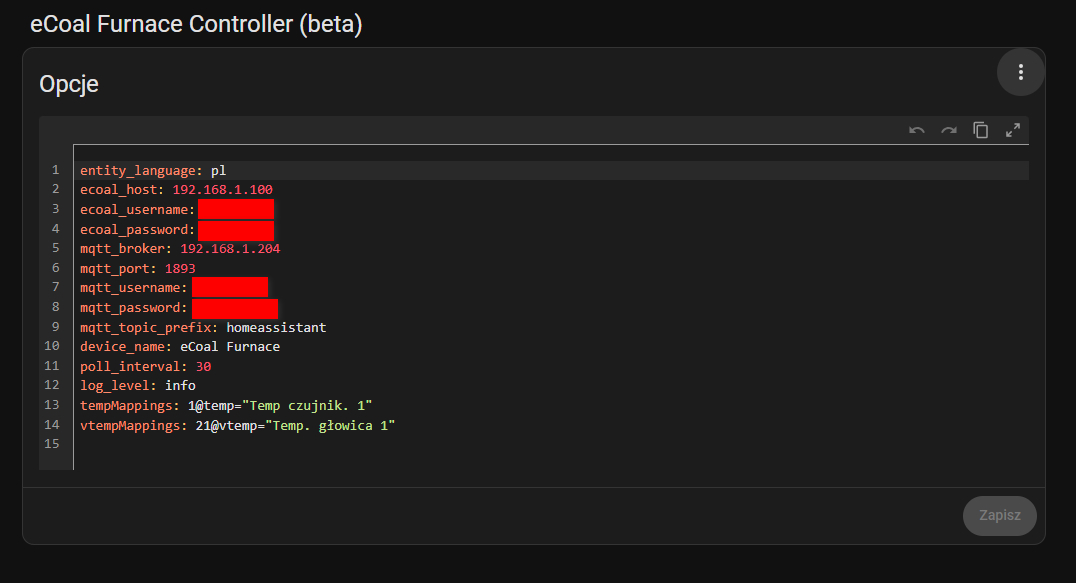 @pitaszek Dodaj sobie repozytorium "https://github.com/MT-ZD/ecoal_controller#next", tam jest nowa, jeszcze nie opublikowana wersja, która pozwoli ci zmapować te dodatkowe pola. W konfiguracji dodatku pojawią się 2 nowe pola: "Mapowanie właściwości temp" oraz "Mapowanie właściwości vtemp". W twoim przypadku możesz w nich wpisać: 1@temp="Temp czujnik. 1";2@vtemp="Temp czujnik. 2" 21@vtemp="Temp. głowica 1";22@vtemp="Temp. głowica 2" Po restarcie dodatku, nowe pola powinny się pojawić w MQTT. Poszukam jeszcze jak mogę dostać typ podajnika i pompę CWU, znalazłem te opcję w apce eCoal więc na 100% da się wyciągnąć. dodane 2025-12-01 15:16 Pompa CWU i typ podajnika dodane na branchu "next". Przy okazji dokopałem się do złota: http://xxx.xxx.xxx.xxx/config/hardware.xml Tam znajdują się wszystkie dostępne wartości, opcje konfiguracyjne itd. razem z opisem co jest czym w 3 językach. Możliwe, że w przyszłości wykorzystam to do dodania wszystkich pozostałych opcji dostępnych w aplikacji eCoal. |
