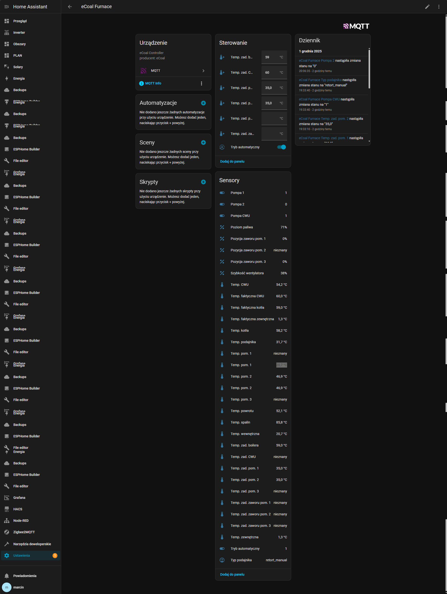 Starting eCoal Furnace Controller... Configuration: /data/options.json 2025-12-01T20:39:53.426Z [INFO] Configuration loaded successfully 2025-12-01T20:39:53.431Z [INFO] Device: eCoal Furnace at 192.168.1.100 2025-12-01T20:39:53.431Z [INFO] Loading configuration... 2025-12-01T20:39:53.432Z [INFO] Loading services... 2025-12-01T20:39:53.436Z [INFO] Connecting to MQTT broker... 2025-12-01T20:39:53.572Z [INFO] Polling scheduled every 30 seconds 2025-12-01T20:39:53.576Z [INFO] eCoal Controller started successfully 2025-12-01T20:39:53.611Z [INFO] Connected to eCoal v3.5 (1.1.38.12) 2025-12-01T20:39:53.633Z [INFO] Connected to MQTT broker at mqtt://192.168.1.204:1893 2025-12-01T20:39:53.642Z [INFO] Published MQTT discovery configurations 2025-12-01T20:39:53.647Z [INFO] Subscribed to command topics: homeassistant/switch/ecoal_furnace/auto_mode/set and number control topics 2025-12-01T20:39:53.726Z [INFO] Fetching custom entries 2025-12-01T20:39:53.733Z [WARN] Custom entry 2@vtemp has no value, skipping. Got: {"vid":"2","tid":"vtemp","status":"not_found"} 2025-12-01T20:39:53.733Z [WARN] Custom entry 22@vtemp has no value, skipping. Got: {"vid":"22","tid":"vtemp","status":"outdated_data"} 2025-12-01T20:40:23.617Z [INFO] Fetching custom entries 2025-12-01T20:40:23.623Z [WARN] Custom entry 2@vtemp has no value, skipping. Got: {"vid":"2","tid":"vtemp","status":"not_found"} 2025-12-01T20:40:23.623Z [WARN] Custom entry 22@vtemp has no value, skipping. Got: {"vid":"22","tid":"vtemp","status":"outdated_data"} 2025-12-01T20:40:53.619Z [INFO] Fetching custom entries 2025-12-01T20:40:53.625Z [WARN] Custom entry 2@vtemp has no value, skipping. Got: {"vid":"2","tid":"vtemp","status":"not_found"} 2025-12-01T20:40:53.626Z [WARN] Custom entry 22@vtemp has no value, skipping. Got: {"vid":"22","tid":"vtemp","status":"outdated_data"} Starting eCoal Furnace Controller... Configuration: /data/options.json 2025-12-01T20:41:02.591Z [INFO] Configuration loaded successfully 2025-12-01T20:41:02.593Z [INFO] Device: eCoal Furnace at 192.168.1.100 2025-12-01T20:41:02.593Z [INFO] Loading configuration... 2025-12-01T20:41:02.594Z [INFO] Loading services... 2025-12-01T20:41:02.596Z [INFO] Connecting to MQTT broker... 2025-12-01T20:41:02.723Z [INFO] Polling scheduled every 30 seconds 2025-12-01T20:41:02.723Z [INFO] eCoal Controller started successfully 2025-12-01T20:41:02.743Z [INFO] Connected to MQTT broker at mqtt://192.168.1.204:1893 2025-12-01T20:41:02.749Z [INFO] Published MQTT discovery configurations 2025-12-01T20:41:02.751Z [INFO] Subscribed to command topics: homeassistant/switch/ecoal_furnace/auto_mode/set and number control topics 2025-12-01T20:41:02.762Z [INFO] Connected to eCoal v3.5 (1.1.38.12) 2025-12-01T20:41:02.815Z [INFO] Fetching custom entries 2025-12-01T20:41:02.822Z [WARN] Custom entry 2@vtemp has no value, skipping. Got: {"vid":"2","tid":"vtemp","status":"not_found"} 2025-12-01T20:41:02.823Z [WARN] Custom entry 22@vtemp has no value, skipping. Got: {"vid":"22","tid":"vtemp","status":"outdated_data"} 2025-12-01T20:41:32.770Z [INFO] Fetching custom entries 2025-12-01T20:41:32.776Z [WARN] Custom entry 2@vtemp has no value, skipping. Got: {"vid":"2","tid":"vtemp","status":"not_found"} 2025-12-01T20:41:32.777Z [WARN] Custom entry 22@vtemp has no value, skipping. Got: {"vid":"22","tid":"vtemp","status":"outdated_data"}Te zdublowane encje były również w wersji oficjalnej. (chodzi mi o encje które występowały pod róznymi nazwami, ale dotyczyły tego samego czujnika. Np. temp kotła i temp. bojlera)Lub np. temp pom 1=nieznany i temp pom 1=20,7 °C Terza dopiero zauważyłem, że godzina w logach jest opóźniona o 1h dodane 2025-12-01 20:49Po aktualizacji bety niektóre są faktycznie zdublowane: ![]() |