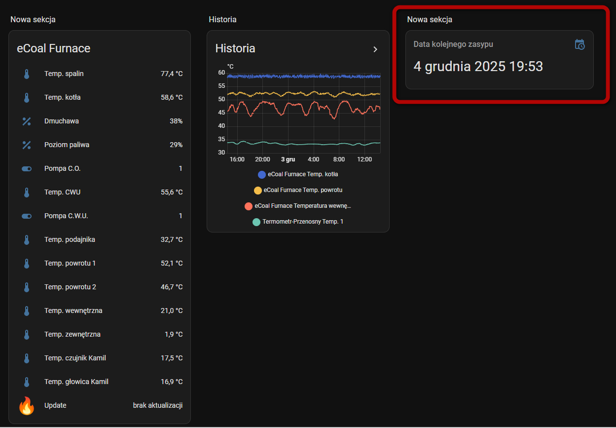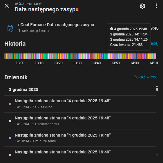 scan_interval: 30 resource: http://192.168.1.100/getregister.cgi?device=0&tzew_value&fuel_level&next_fuel_time&tryb_auto_state&tcwu_value&tkot_value&twew_value&act_dm_speed&tpow_value&tsp_value&1@temp&21@vtemp sensor: ### Odczyt temperatury zewnętrznej - name: eCoal Temperatura zewnętrzna unique_id: ecoal_temperatura_zewnetrzna value_template: {{ value_json["cmd"]["device"]["reg"][0]["@v"] }} unit_of_measurement: "°C" ### Odczyt poziomu paliwa - name: eCoal Poziom paliwa unique_id: ecoal_poziom_paliwa value_template: {{ value_json["cmd"]["device"]["reg"][1]["@v"] }} unit_of_measurement: "%" ### Odczyt daty następnego zasypu - name: eCoal Data zasypu unique_id: ecoal_data_zasypu value_template: {{ value_json["cmd"]["device"]["reg"][2]["@v"] | int | timestamp_custom("%Y-%m-%d %H:%M") }} ### Odczyt stanu pracy kotła - name: eCoal Tryb pracy kotła unique_id: ecoal_tryb_pracy_kotla value_template: {{ value_json["cmd"]["device"]["reg"][3]["@v"] }} ### Odczyt temperatury CWU - name: eCoal Temperatura CWU unique_id: ecoal_temperatura_cwu value_template: {{ value_json["cmd"]["device"]["reg"][4]["@v"] }} unit_of_measurement: "°C" ### Odczyt temperatury kotła - name: eCoal Temperatura kotła unique_id: ecoal_temperatura_kotla value_template: {{ value_json["cmd"]["device"]["reg"][5]["@v"] }} unit_of_measurement: "°C" ### Odczyt temperatury wewnętrznaj - name: eCoal Temperatura wewnętrzna unique_id: ecoal_temperatura_wewnetrzna value_template: {{ value_json["cmd"]["device"]["reg"][6]["@v"] }} unit_of_measurement: "°C" ### Odczyt mocy dmuchawy - name: eCoal Aktualna moc dmuchawy unique_id: ecoal_aktualna_moc_dmuchawy value_template: {{ value_json["cmd"]["device"]["reg"][7]["@v"] }} unit_of_measurement: "%" ### Odczyt temperatury powrotu - name: eCoal Temperatura powrotu unique_id: ecoal_temperatura_powrotu value_template: {{ value_json["cmd"]["device"]["reg"][8]["@v"] }} unit_of_measurement: "°C" ### Odczyt temperatury spalin - name: eCoal Temperatura spalin unique_id: ecoal_temperatura_spalin value_template: {{ value_json["cmd"]["device"]["reg"][9]["@v"] }} unit_of_measurement: "°C" ### Odczyt temperatury z czujnika Kamil - name: eCoal Temperatura czujnik Kamil unique_id: ecoal_temperatura_czujnik_Kamil value_template: {{ value_json["cmd"]["device"]["reg"][10]["@v"] }} unit_of_measurement: "°C" ### Odczyt temperatury z głowicy Kamil - name: eCoal Temperatura głowica Kamil unique_id: ecoal_temperatura_glowica_Kamil value_template: {{ value_json["cmd"]["device"]["reg"][11]["@v"] }} unit_of_measurement: "°C" A jest tak: ![]() dodane 2025-12-03 13:13Co ciekawe, stan encji raportuje poprawnie: sensor.ecoal_furnace_data_nastepnego_zasypu eCoal Furnace Data następnego zasypu 2025-12-04T18:50:07+00:00 device_class: timestamp icon: mdi:calendar-clock friendly_name: eCoal Furnace Data następnego zasypu choć (tak jak w logach), przesunięta jest o godzinę. Historia encji podaje już właściwie: ![]() dodane 2025-12-03 13:30Ok. Wystarczy wybrać inną kartę. ![]() ![]() |