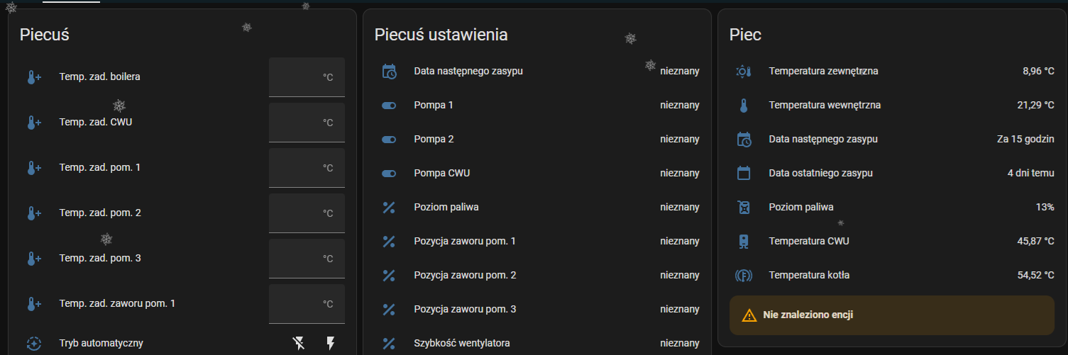 Zastanawiające jest o tyle, że mam faktycznie problem z ręcznym odczytem nawet (zahardkodowane sensory), ALE temperaturę zewnętrzną mam na bieżąco, a pozostałe rejestry nie odpowiadały... Spróbowałem zrestartować sieć w okolicy pieca, zobaczę co przyniesie.