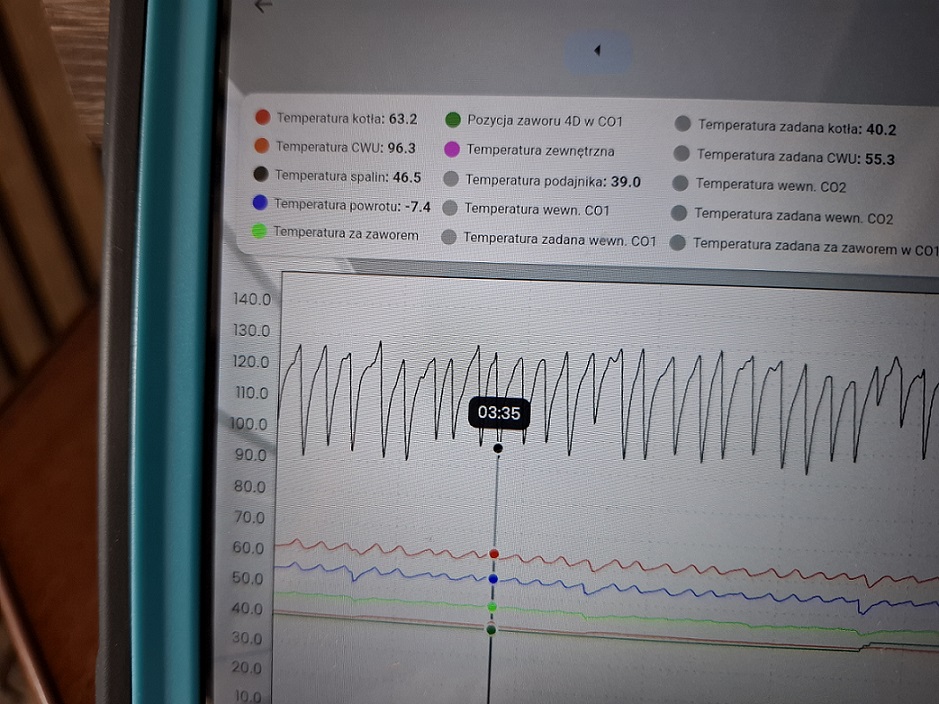 1. Podczas załączenia zewnętrznego termostatu dla CO1 nie zmienia się piktogram i cały czas jest termometr z X 2. Odczyt wartości z wykresu po przytrzymaniu np. obwodu CO1 jest totalnie nieprawidłowy np.CWU ma ponad 100, a obecnie jest wyłączona. |