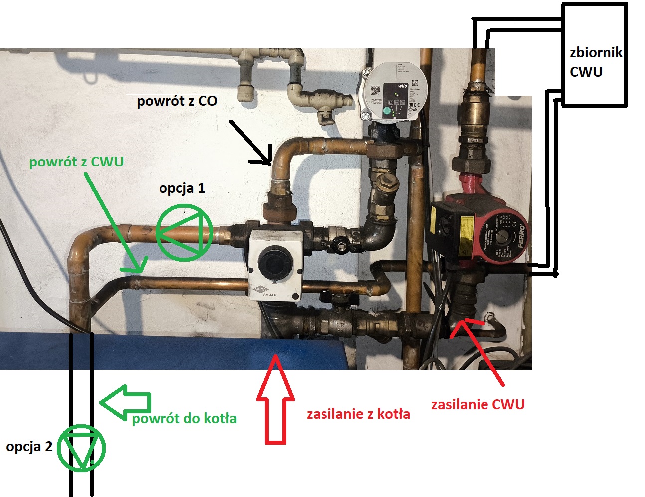 Chcę zamontować pompę kotłową za zaworem 4D w celu ochrony powrotu. Hydraulik pominął ten krok. Sytuacja jest taka, że gdy zawór 4D jest wysterowany powyżej 30% to temperatura powrotu drastycznie spada. Poniżej zdjęcie i pytanie czy pompę mogę zamontować w miejscu oznaczonym jako "opcja 2" ( mam tam dużo miejsca), czy koniecznie musi być tuż za zaworem 4D (opcja 1). W przypadku montażu w opcji 2 moja obawa jest taka, że działanie tej pompy spowoduje niejako wymuszenie obiegu gorącej wody z kotła przez zbiornik CWU - dobrze myślę ? Czy może opory niedziałającej pompy z CWU na to nie pozwolą ? |