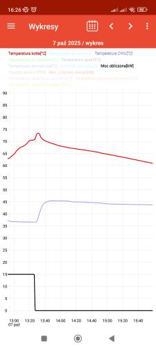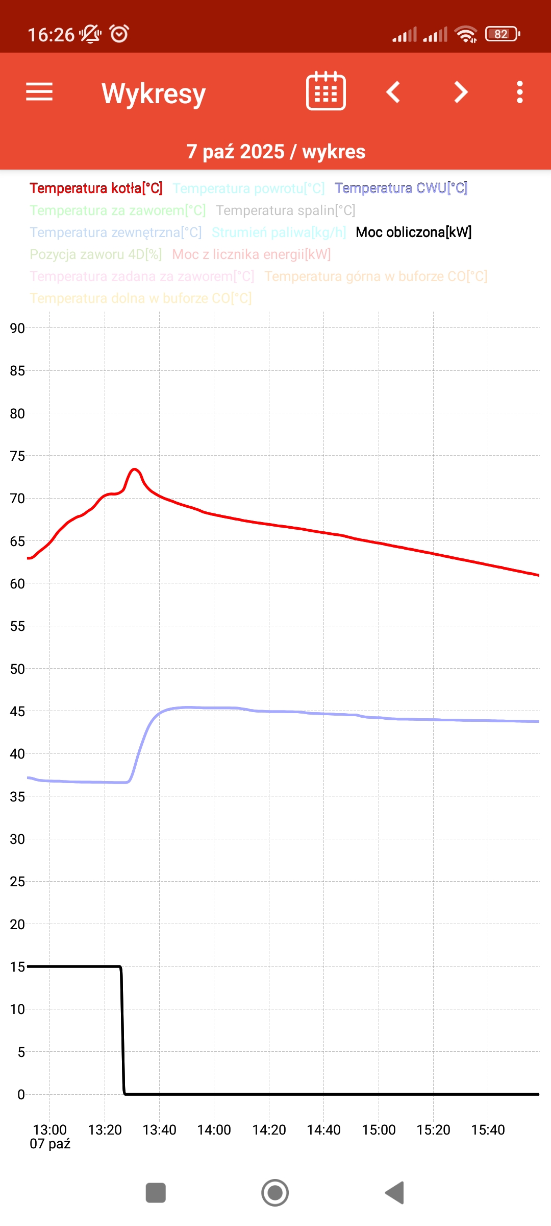 Czy jest jakaś szansa na aktualizację softu przy włączonej opcji bufora? Co tyczy się pracy pompy CWU lub ładującej bufor po rozpoczęciu procesu wygaszania palnika, osiągnięcia zadanej na dolnym czujniku. Tak dla przykładu...grzejemy bufor, osiągamy zadaną na dolnym czujniku. Palnik zaczyna proces wygaszania, pompa ładująca bufor wyłącza się. Z powodu braku odbioru ciepła jak i dopalenia reszty paliwa na palniku z przykładowych 70st na kotle temperatura potrafi dojść w okolice 80st. Instalacja odpala się dwa razy na dobę. Z tych 80st kocioł wystudza się do poziomu 30-40st, a jeżeli jest w piwnicy znacznie bardziej. Czyli te kilkadziesiąt litrów czynnika podgrzane do 80st idzie po prostu w komin, a można te ciepło wykorzystać. Mi chodzą po głowie dwa rozwiązania. 1. Opcja "+3, +1" tak jak tyczy się to obecnie do pracy pompy ładującej bufor dla dolnego czujnika i temperatury kotła. A także pracy pompy CWU i czujnika temperatury względem temperatury kotła. Czyli po osiągnięciu zadanej na dolnym czujniku i starcie wygaszania opcja "+3, +1" dla pracy pompy ładującej bufor dla górnego czujnika. Lub taka sama opcja dla pracy pompy CWU. Do wyboru przez użytkownika. 2. Opcja z pracą pompy ładującej bufor lub CWU w wyznaczonym przedziale czasowym mając zakres np 1-30min, każdy dostosuje do siebie. Po osiągnięciu zadanej na dolnym czujniku. Obecnie stosuje do tych celów(podgrzanie CWU) zewnętrzny sterownik ale ma swoje ograniczenia. Dla tego jednego przykładu jak poniżej pompa CWU załącza się przy 72st i wyłącza przy 70st. Przy tak małej delcie temperatur woda jest w stanie podgrzać się o kilka stopni, zbiornik 140l. dodane 2025-10-07 14:33 ![]() |