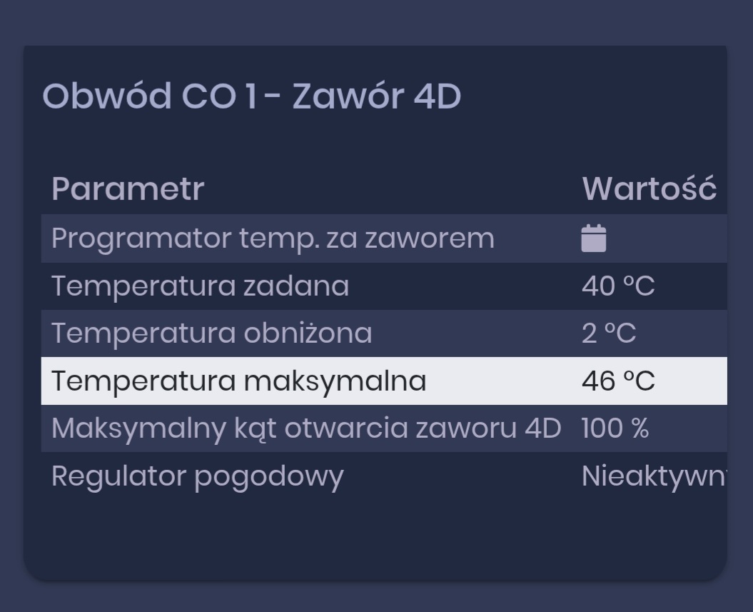 Temperatura maksymalna zaworu 46st jest prawdopodobnie za nisko ustawiona. Ale być może to dobry bezpiecznik na podłogówkę. To z tego powodu prawdopodobnie zamyka ci zawór bo chwilowo idzie wyższa temp i odpala alarm. Skasuj alarm i ewentualnie podnieś ten parametr albo tak zostaw. Przy przejściu z trybu zima na lato zwykle przegrzewa kociołek i pewnie temp na CO. |