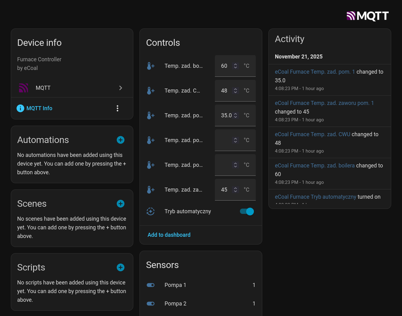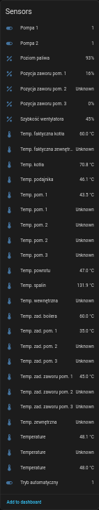 stworzyłem dodatek do Home Assistant OS umożliwiający komunikację ze sterownikiem za pomocą MQTT. Pozwala nie tylko na odczyt danych ale też zmianę zadanych temperatur. Jest to wersja pierwsza tego dodatku, więc można się spodziewać błędów, jednak na mojej instalacji działa już od około miesiąca bez problemów. Dodatek wraz z instrukcją instalacji (po angielsku) można znaleźć tutaj: https://github.com/MT-ZD/ecoal_controller/tree/master/eCoal Wymagania to integracja z MQTT i Broker MQTT (np. Mosquitto). ![]() ![]() |